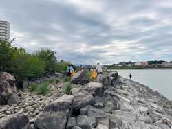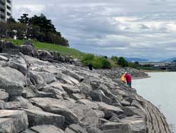 | 今回は、さやか公園のまえの干潟の箇所を行いました。まだまだ水位が低いのので、石垣の間に |